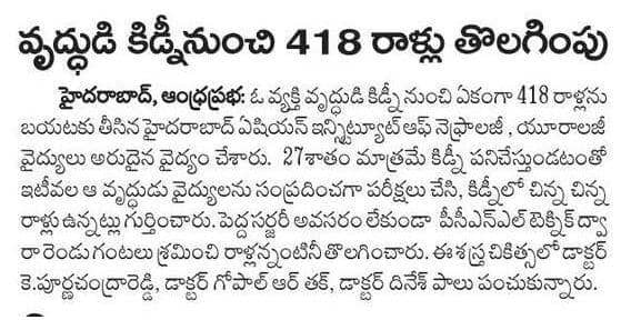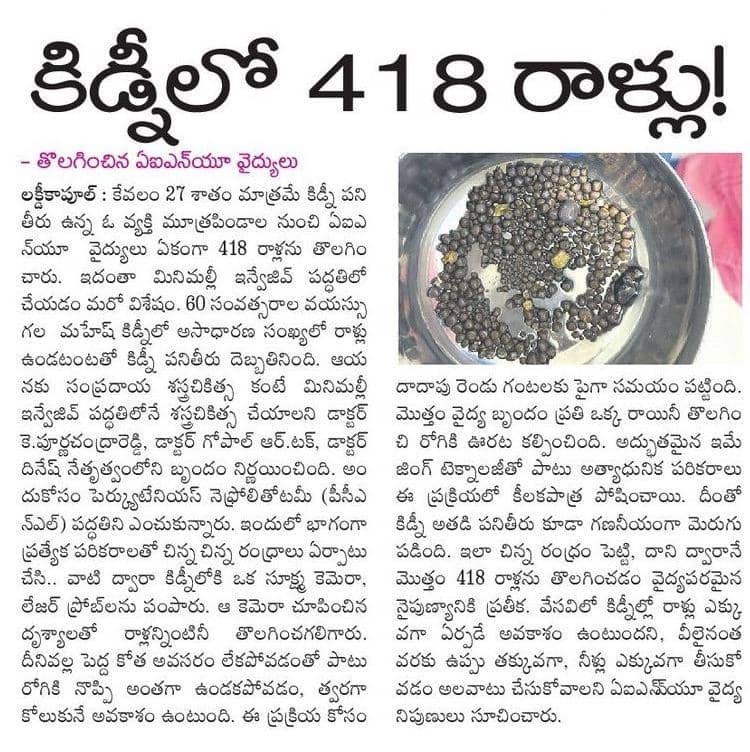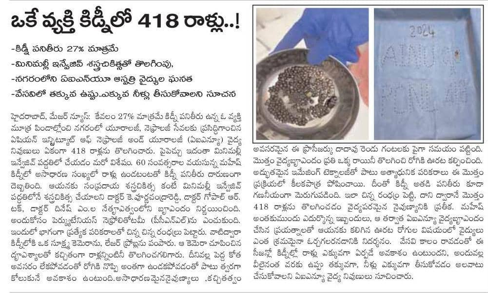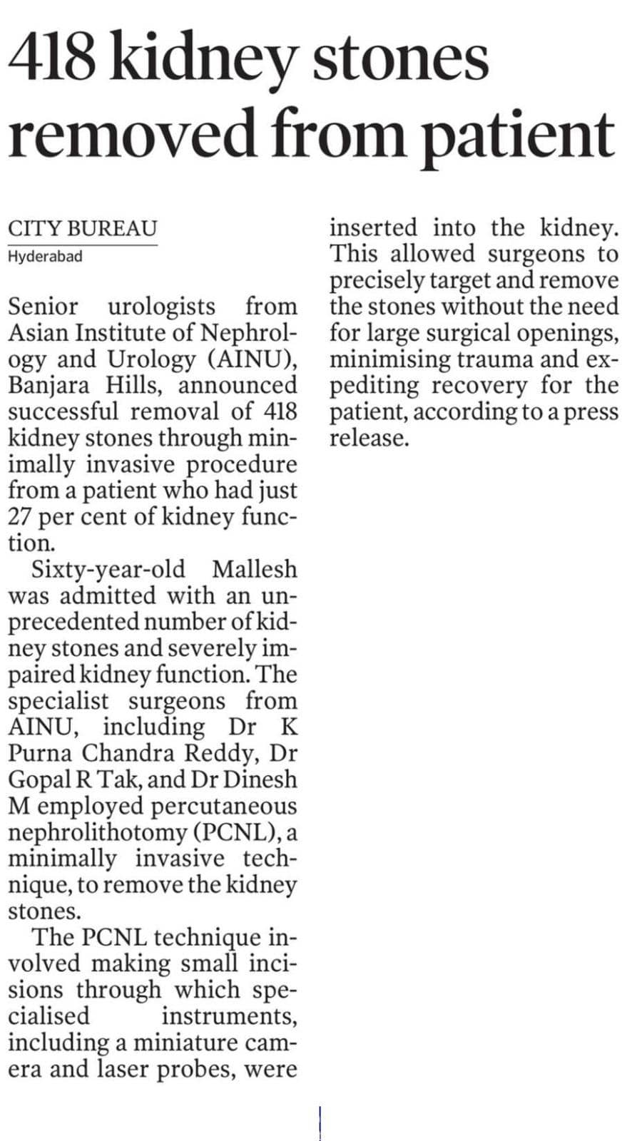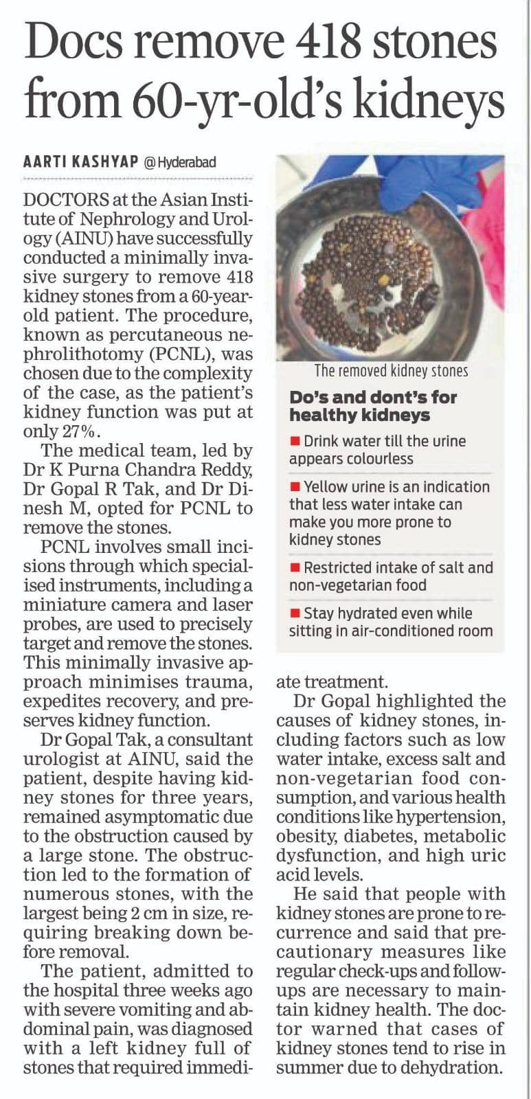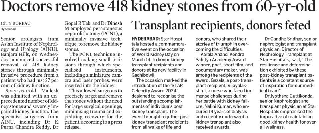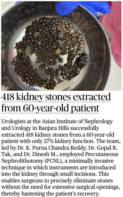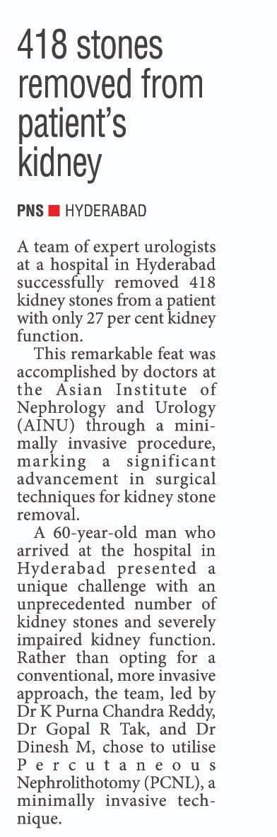 March 13th, 2024 - In a ground-breaking medical achievement, the team of expert urologists at the Asian Institute of Nephrology and Urology, Banjara Hills, Hyderabad, has successfully removed 418 kidney stones from a patient with only 27% kidney function. This remarkable feat was accomplished through a minimally invasive procedure, marking a significant advancement in surgical techniques for kidney stone removal.