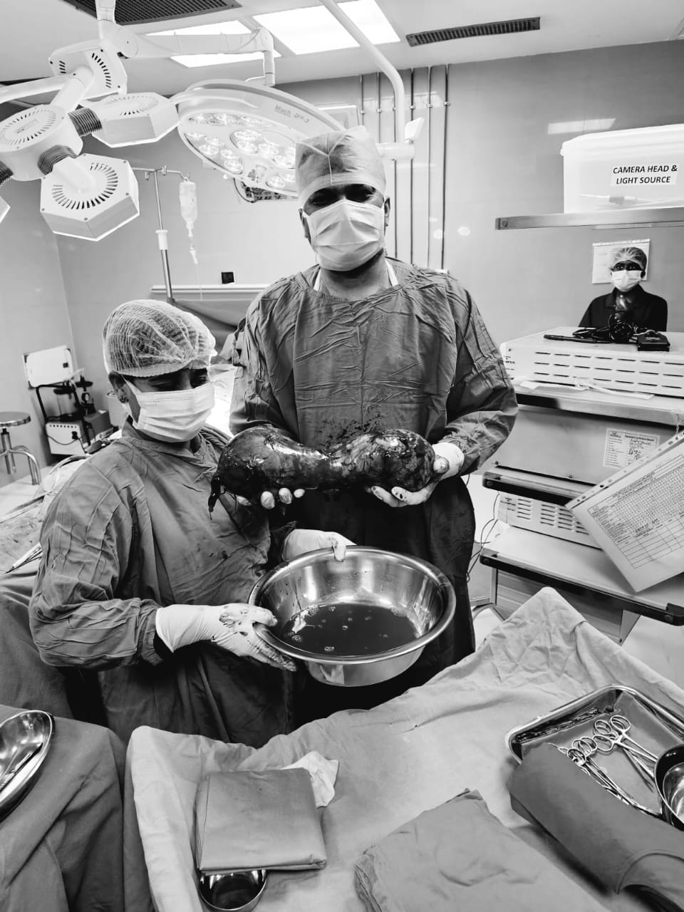 Dr. Rajesh Kumar Reddy Adapala, a consultant uro-oncologist, led the challenging surgery with surgical support from Dr. Dinesh. The anesthesia team, led by Dr. Nithyananda and Dr. Shifa, provided exceptional support, ensuring a smooth operation. Dr. Srikanth provided critical peri-operative Nephrology care, which was crucial for the patient’s recovery.