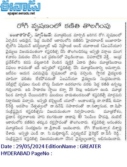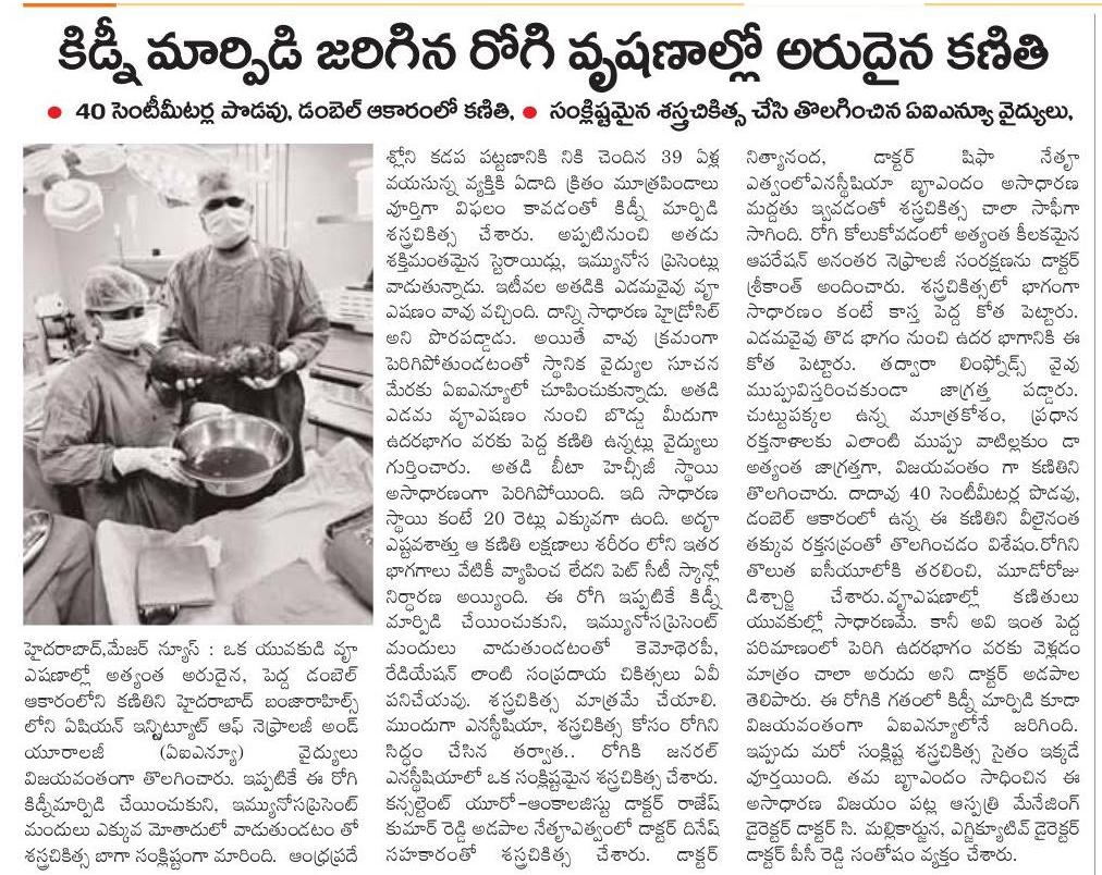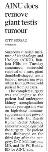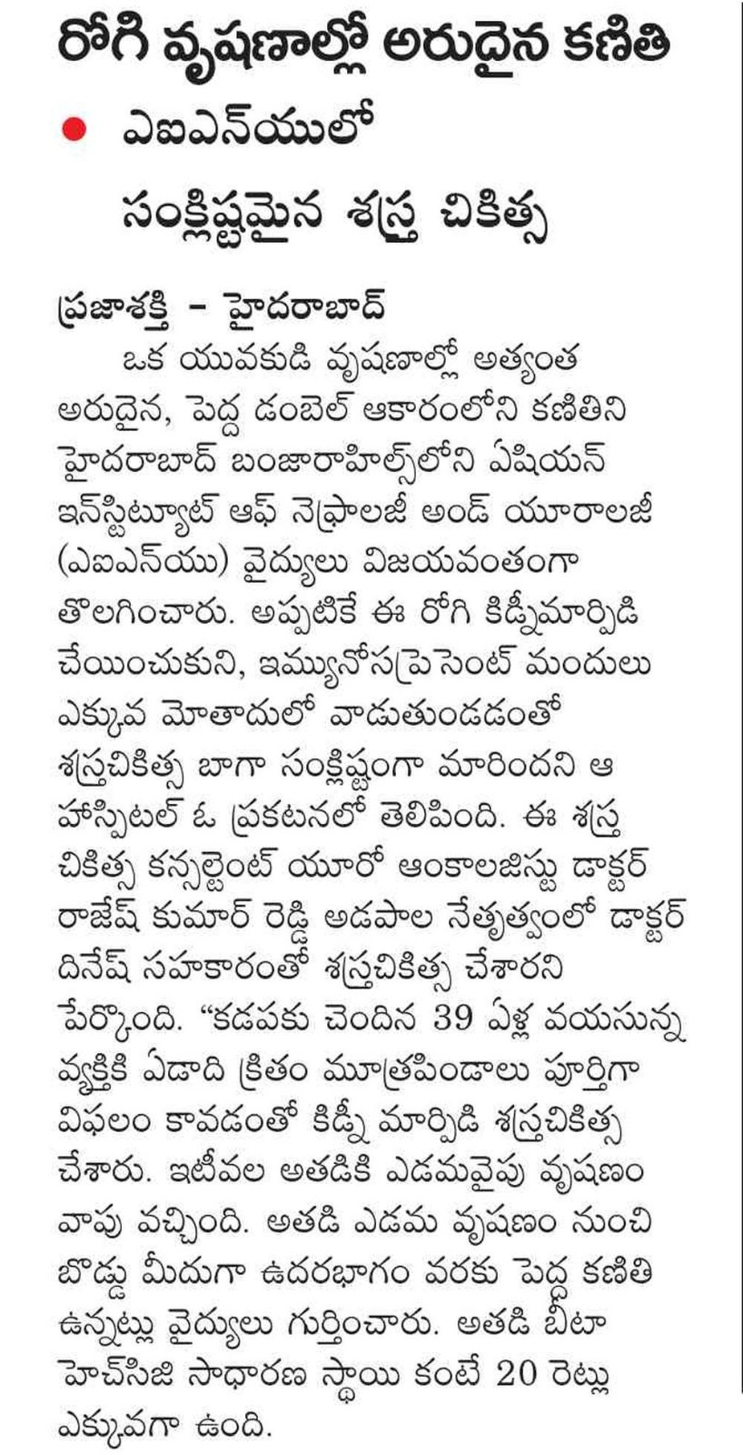 ఒక యువ‌కుడి వృష‌ణాల్లో అత్యంత అరుదైన‌, పెద్ద డంబెల్ ఆకారంలోని క‌ణితిని హైద‌రాబాద్ బంజారాహిల్స్‌లోని ఏషియ‌న్ ఇన్‌స్టిట్యూట్ ఆఫ్ నెఫ్రాల‌జీ అండ్ యూరాల‌జీ (ఏఐఎన్‌యూ) వైద్యులు విజ‌య‌వంతంగా తొల‌గించారు. ఇప్ప‌టికే ఈ రోగి కిడ్నీమార్పిడి చేయించుకుని, ఇమ్యునోస‌ప్రెసెంట్ మందులు ఎక్కువ మోతాదులో వాడుతుండ‌టంతో శ‌స్త్రచికిత్స బాగా సంక్లిష్టంగా మారింది.