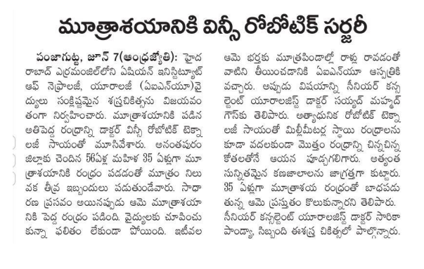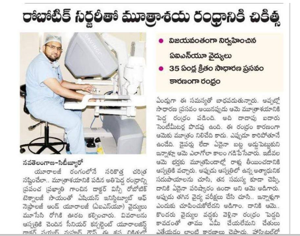 యూరాలజీ రంగంలోనే సరికొత్త చరిత్ర సృష్టించేలా.. మూత్రాశయానికి పడిన అతిపెద్ద రంధ్రాన్ని ప్రపంచ ప్రఖ్యాతి గాంచిన డా విన్సీ రోబోటిక్ టెక్నాలజీ సాయంతో మూసేసిన ఏషియన్ ఇన్స్టిట్యూట్ ఆఫ్ నెఫ్రాలజీ అండ్ యూరాలజీ (ఏఐఎన్యూ) వైద్యులు.. రోగికి ఊరట కల్పించారు. ఇందుకు సంబంధించిన వివరాలను ఆస్పత్రికి చెందిన సీనియర్ కన్సల్టెంట్ యూరాలజిస్ట్ డాక్టర్ సయ్యద్ మహ్మద్ గౌస్ తెలిపారు. ఏఐఎన్యూలోని సీనియర్ కన్సల్టెంట్ మహిళా యూరాలజిస్ట్ డాక్టర్ సారికా పాండ్యా కూడా ఈ శస్త్రచికిత్సలో పాల్గొన్నారు.