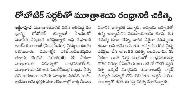 రరోబోటిక్ సర్జరీతో మూత్రాశయ రంధ్రానికి చికిత్స చేసిన ఏఐఎన్యూ వైద్యులు 35 ఏళ్ల క్రితం సాధారణ ప్రసవం కారణంగా రంధ్రం
