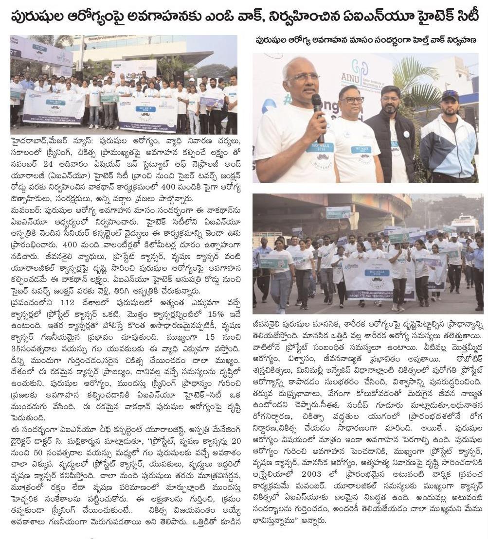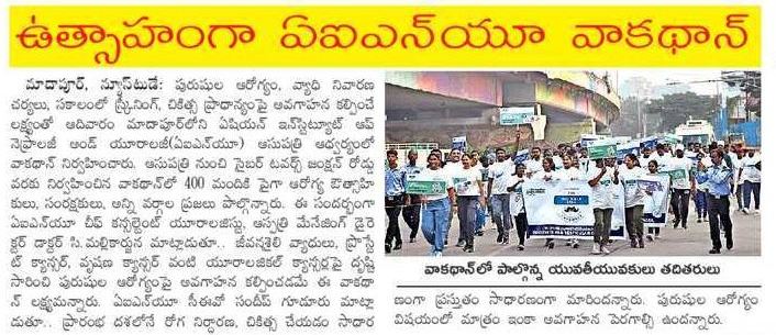 The event was flagged off by senior consultants of AINU, Hitec-City. The awareness drive witnessed 400 volunteers enthusiastically walking across the busy streets, covering several kilometers. The walkathon was aimed at creating awareness about men’s health, with a focus on lifestyle diseases and urological cancer like prostate cancer, testicular cancer, etc. Participants walked from AINU Hitec hospital road to the cyber towers junction & back to hospital.