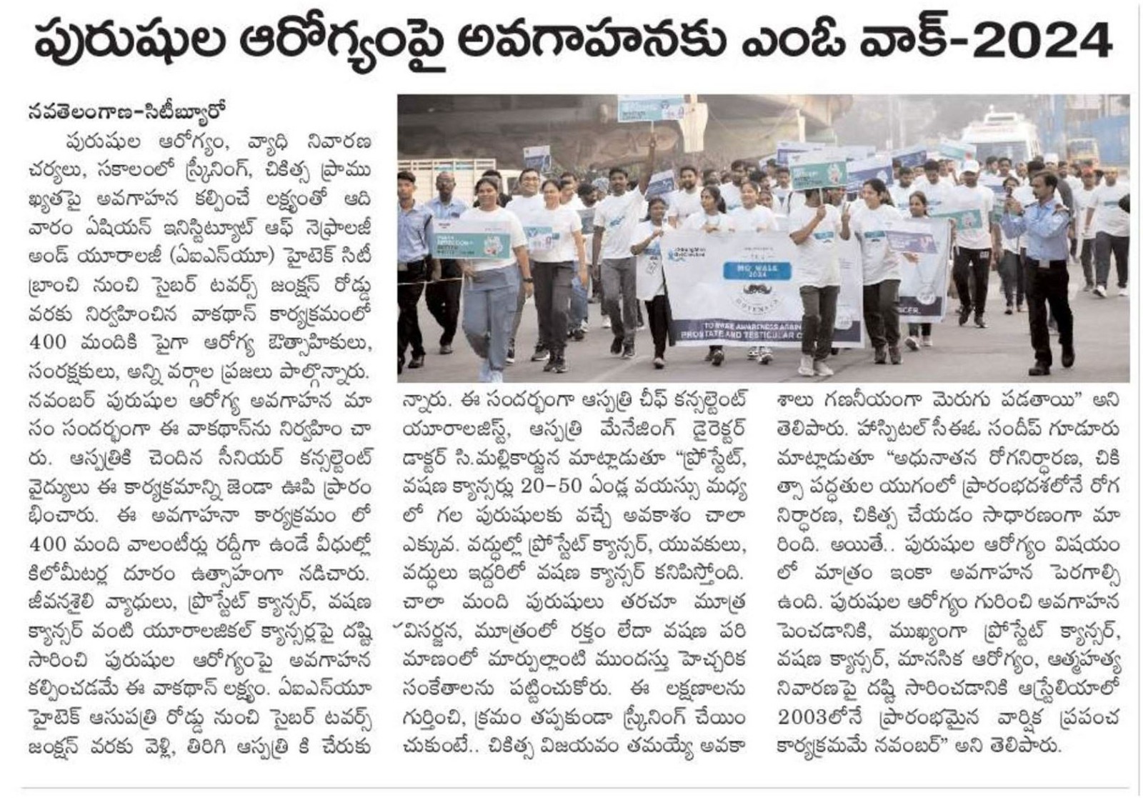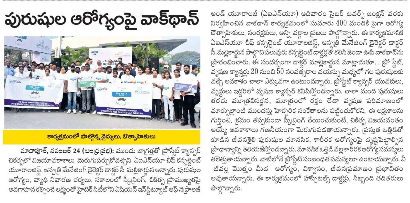 Over 400 health enthusiasts, caregivers, and people from all walks of life turned up to take part in a walkathon event organised by Asian Institute of Nephrology and Urology, Hitec-City hospital to Cyber Towers Junction Road on 24th November Sunday on the occasion of Movember: Mens Health Awareness Month, aimed at creating awareness about mens health and preventive measures and the importance of timely screening and treatment.