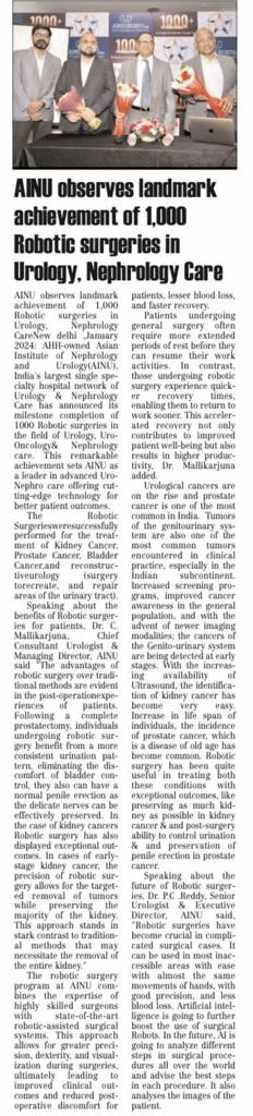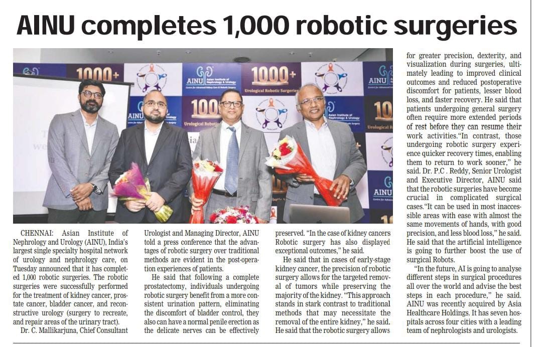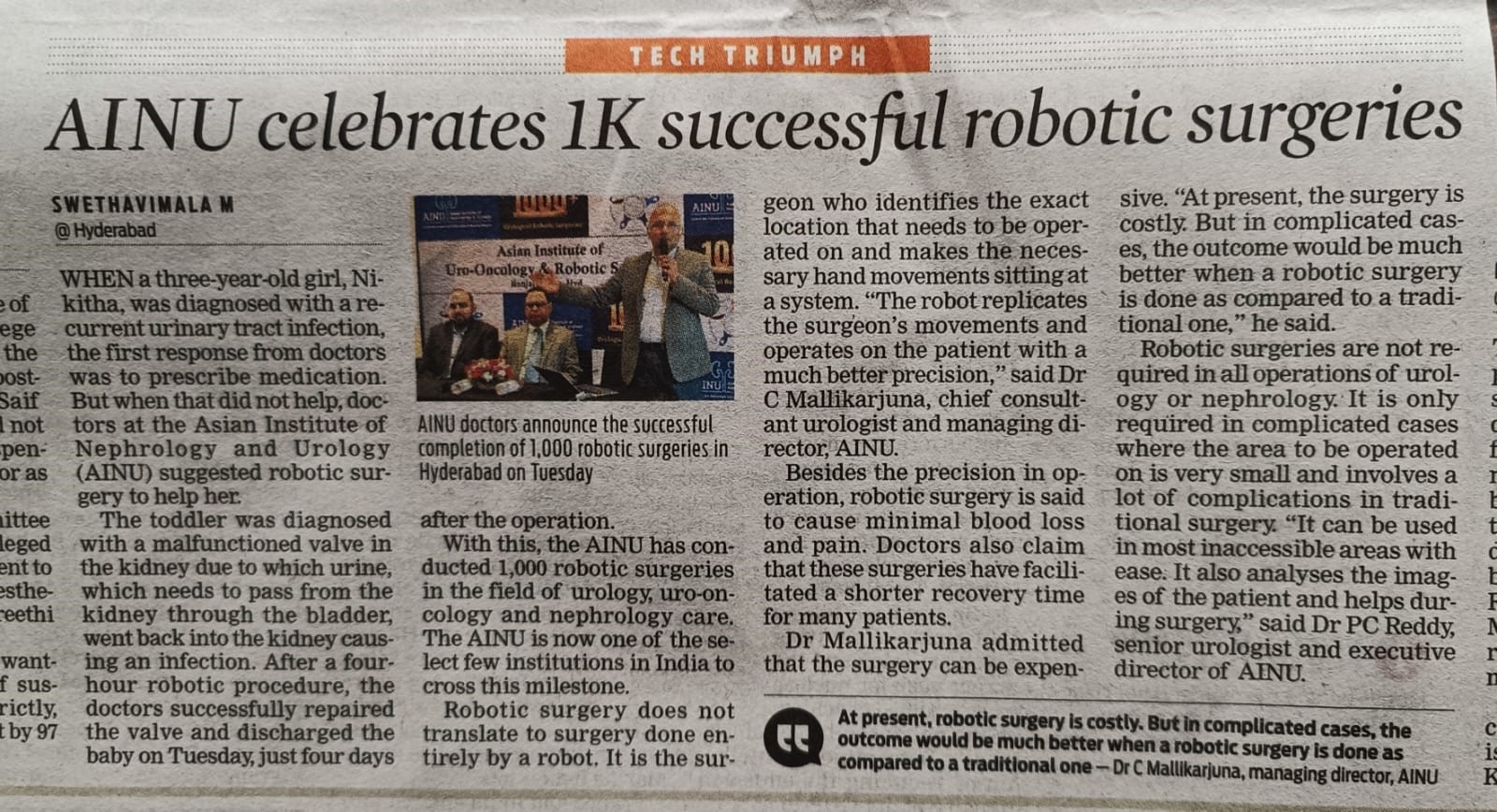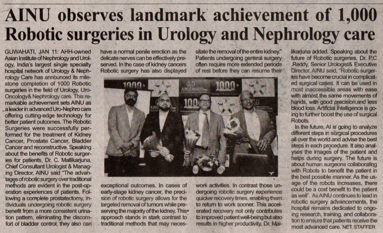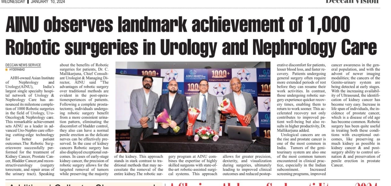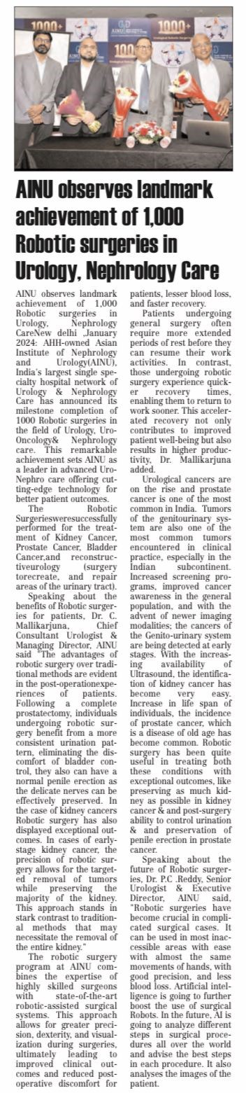 Hyderabad, 9th January 2024: AHH-owned Asian Institute of Nephrology and Urology (AINU), India’s largest single specialty hospital network of Urology & Nephrology Care has announced its milestone completion of 1000 Robotic surgeries in the field of Urology, Uro-Oncology& Nephrology care. This remarkable achievement sets AINU as a leader in advanced Uro-Nephro care offering cutting-edge technology for better patient outcomes.