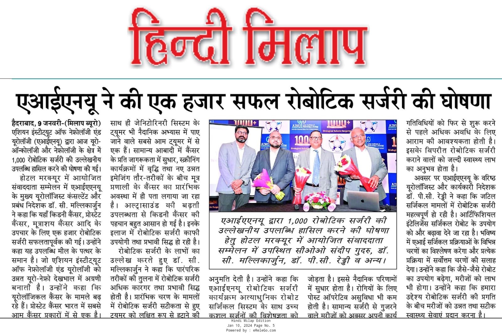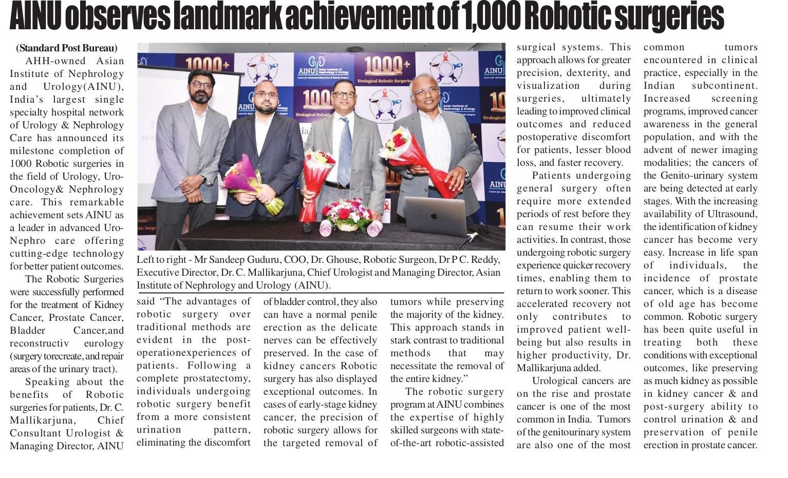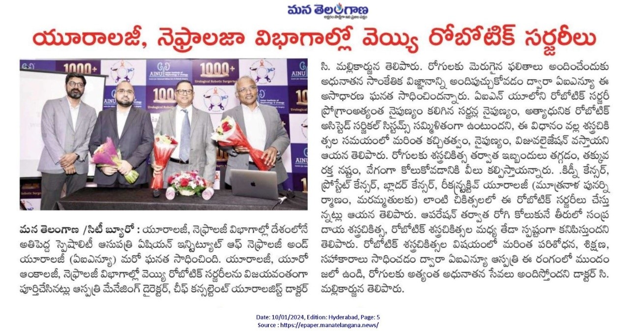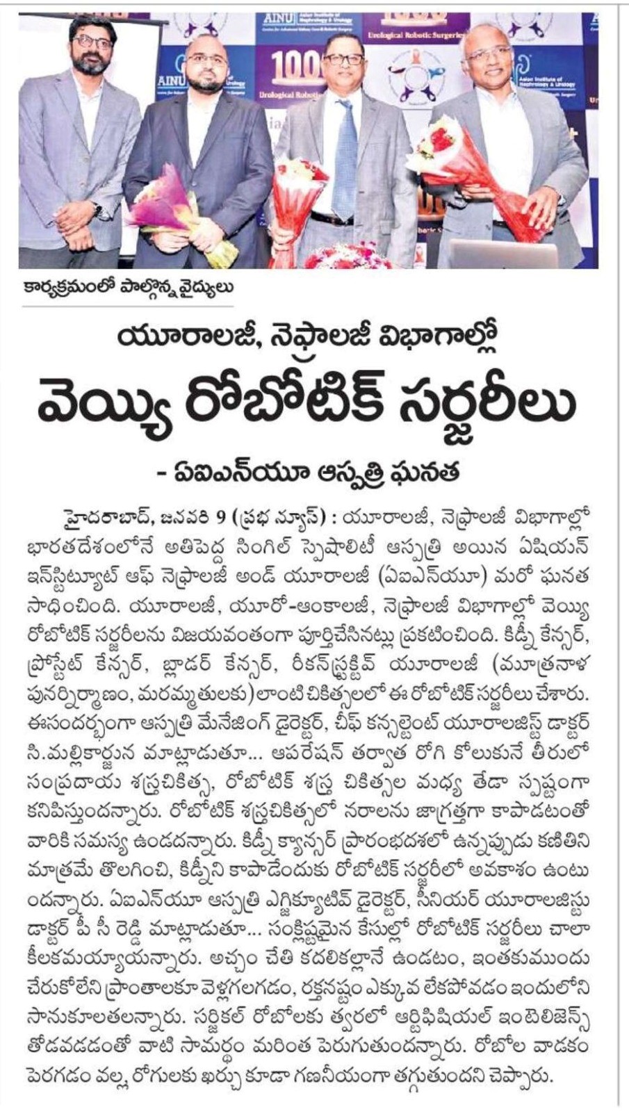 Hyderabad, 9th January 2024: AHH-owned Asian Institute of Nephrology and Urology (AINU), India’s largest single specialty hospital network of Urology & Nephrology Care has announced its milestone completion of 1000 Robotic surgeries in the field of Urology, Uro-Oncology& Nephrology care. This remarkable achievement sets AINU as a leader in advanced Uro-Nephro care offering cutting-edge technology for better patient outcomes.