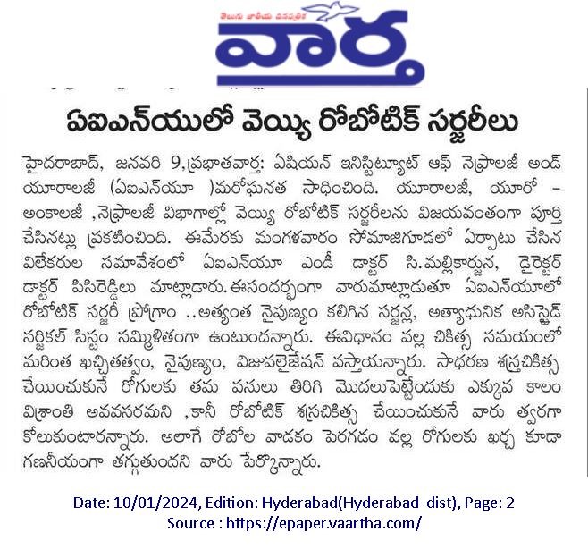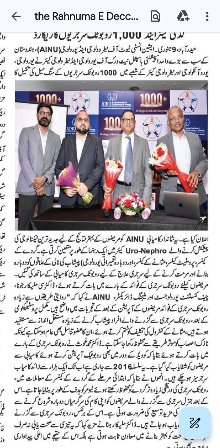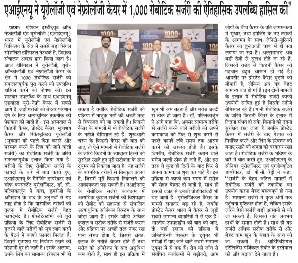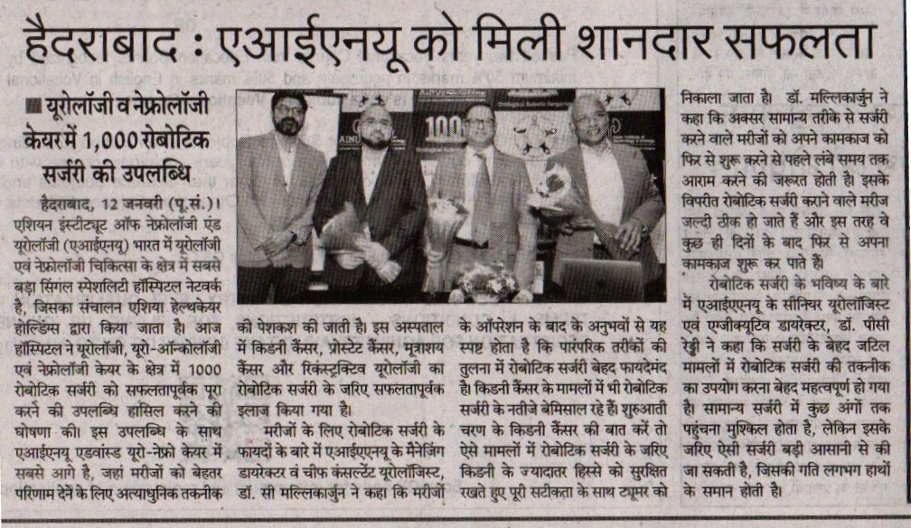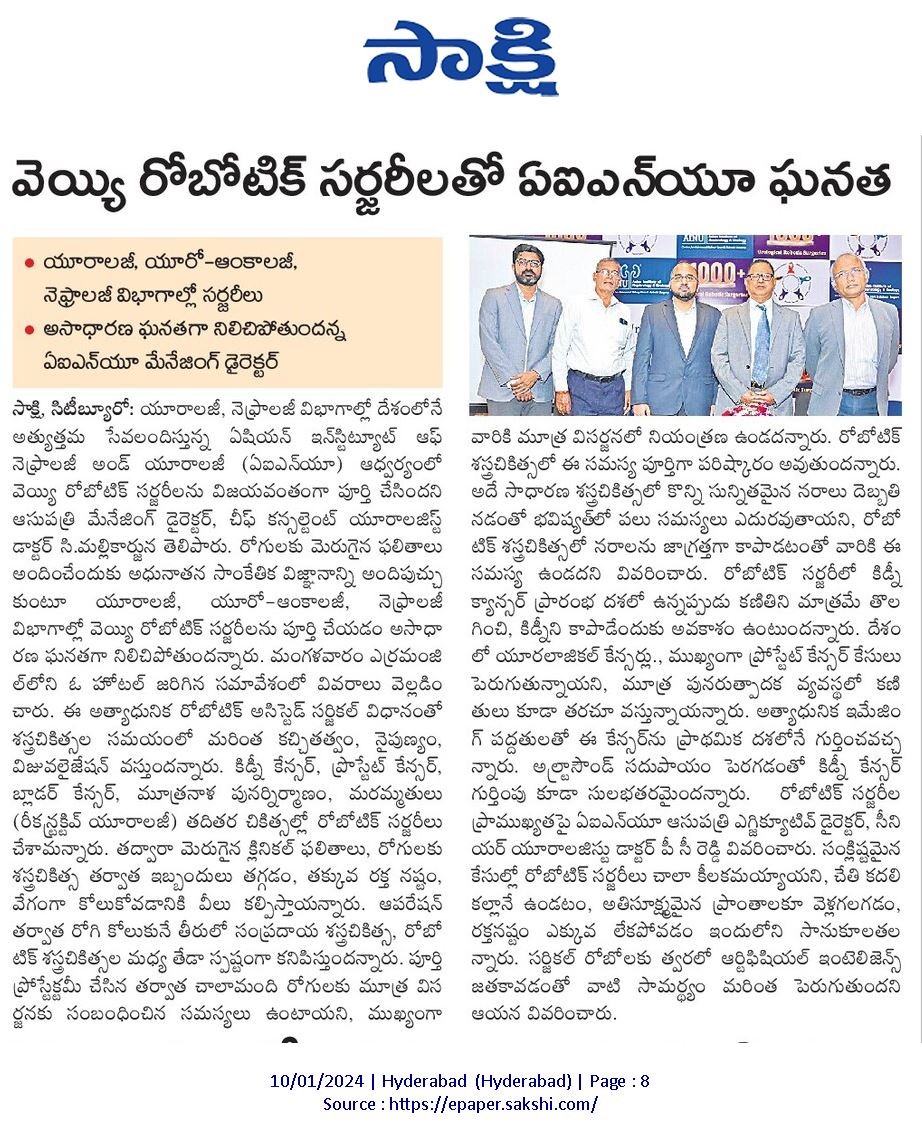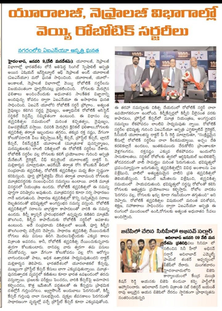 Hyderabad, 9th January 2024: AHH-owned Asian Institute of Nephrology and Urology (AINU), India’s largest single specialty hospital network of Urology & Nephrology Care has announced its milestone completion of 1000 Robotic surgeries in the field of Urology, Uro-Oncology& Nephrology care. This remarkable achievement sets AINU as a leader in advanced Uro-Nephro care offering cutting-edge technology for better patient outcomes.