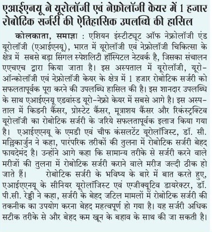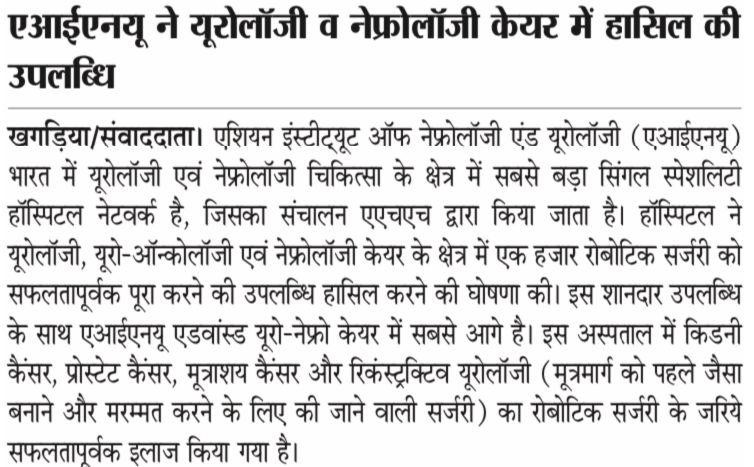 Asian Institute of Nephrology & Urology is India’s largest single specialty hospital network in Urology & Nephrology. Recently it has been acquired by Asia Healthcare Holdings. It has seven hospitals across four cities with a leading team of nephrologists and urologists. Recognized for its clinical expertise in the field of Urology and Nephrology, the hospitals offer services such as Uro-Oncology, Reconstructive Urology, Paediatric Urology, Female Urology, Andrology, Kidney Transplants and Dialysis. It is a pioneer of Robotic Urology surgery in India. The hospital has a network of over 500 beds in the country and has treated over lac patients. AINU has accreditation from NABH, DNB (Urology & Nephrology) and FNB (Minimal Invasive Urology).
