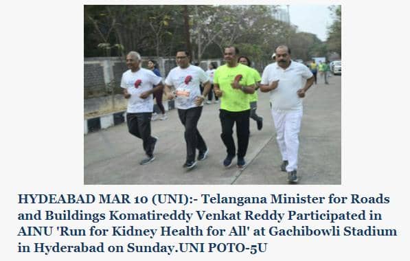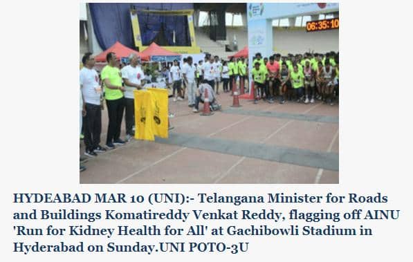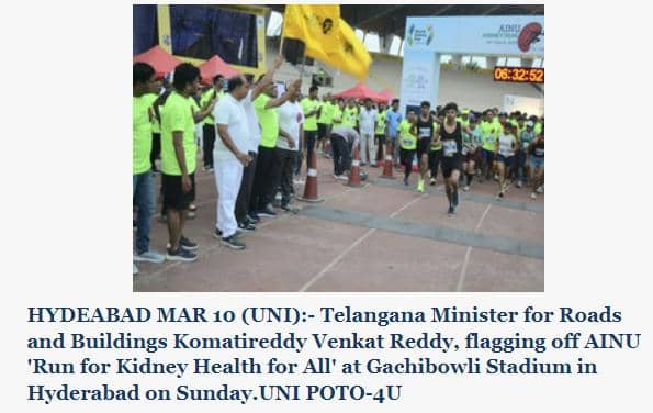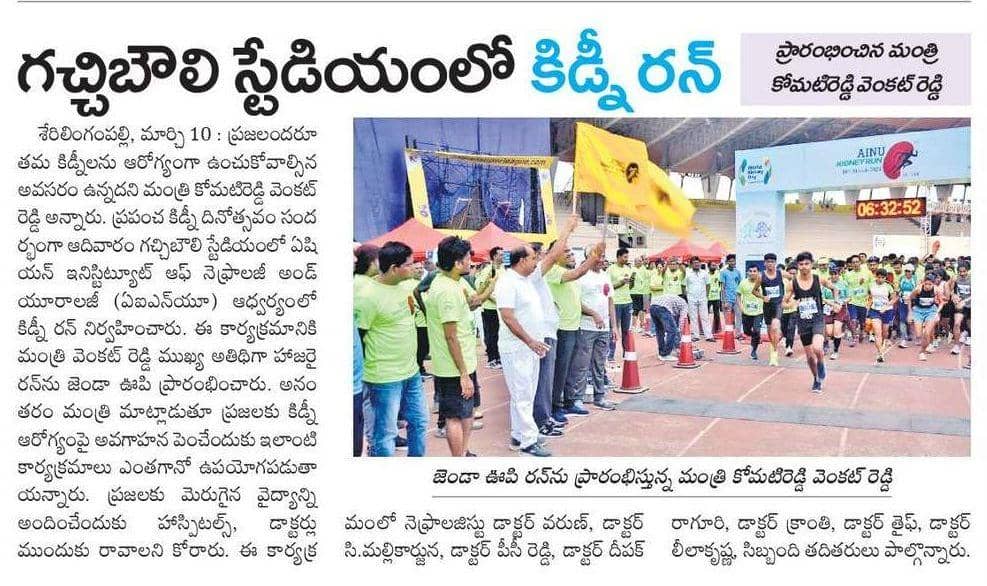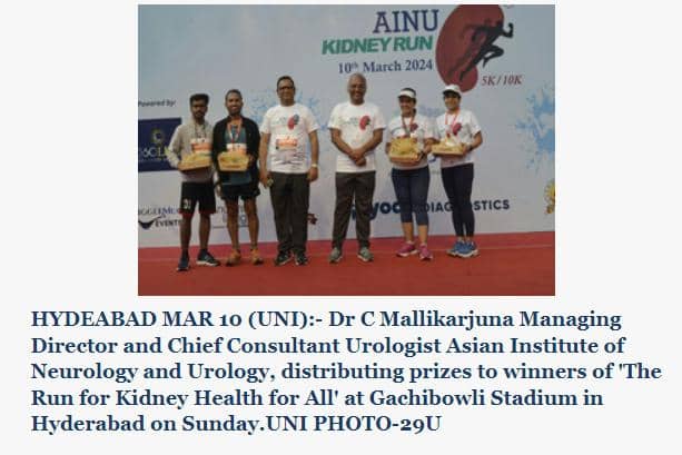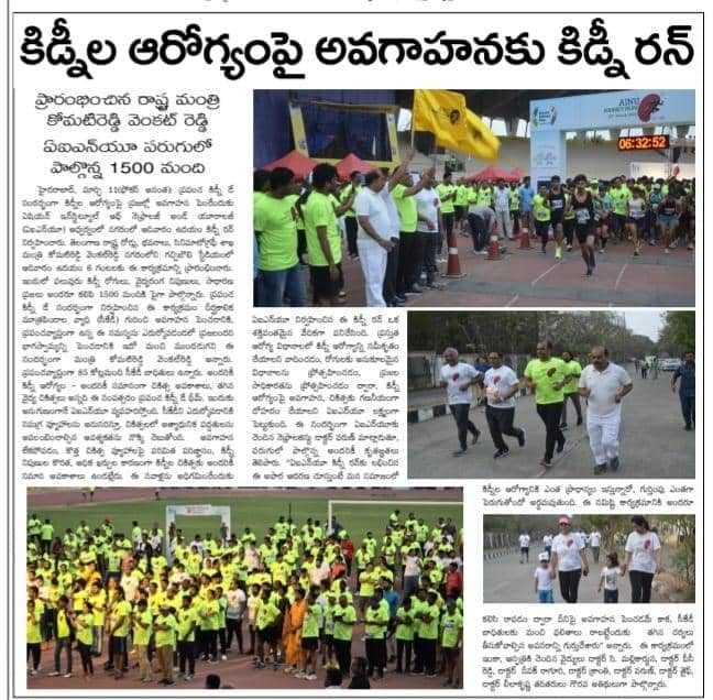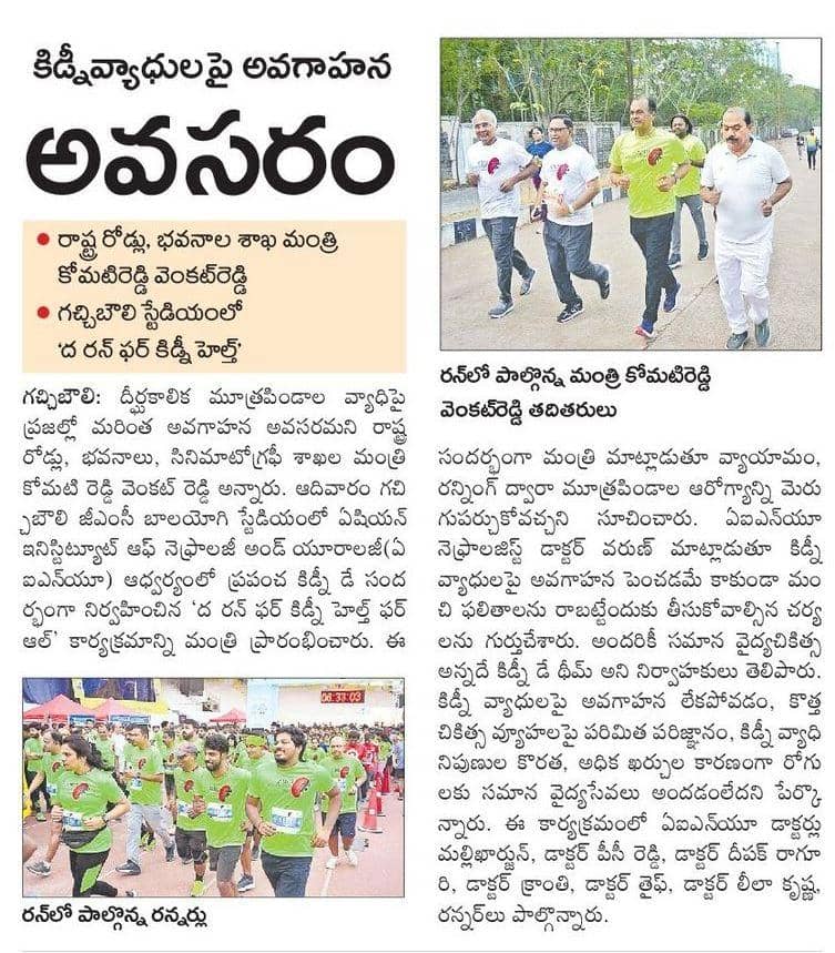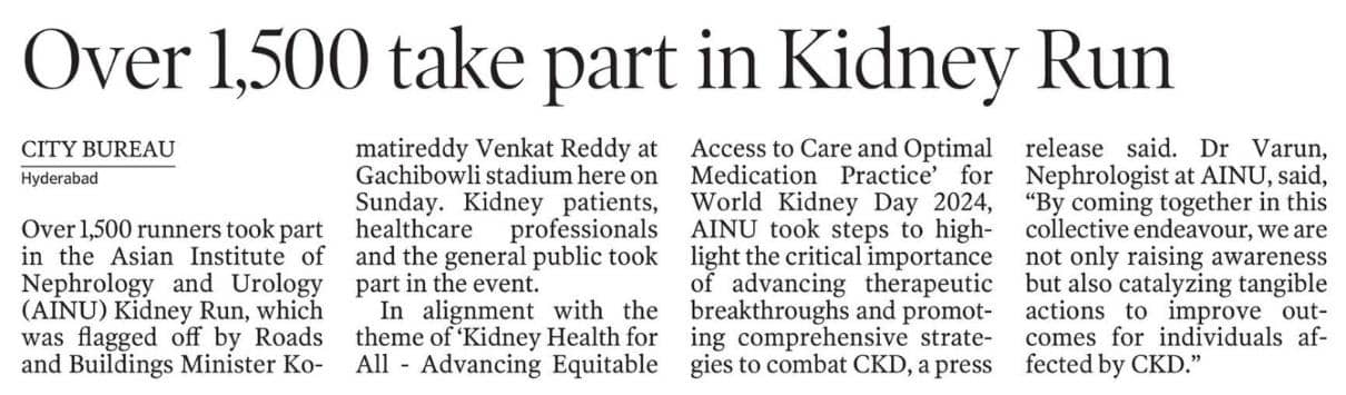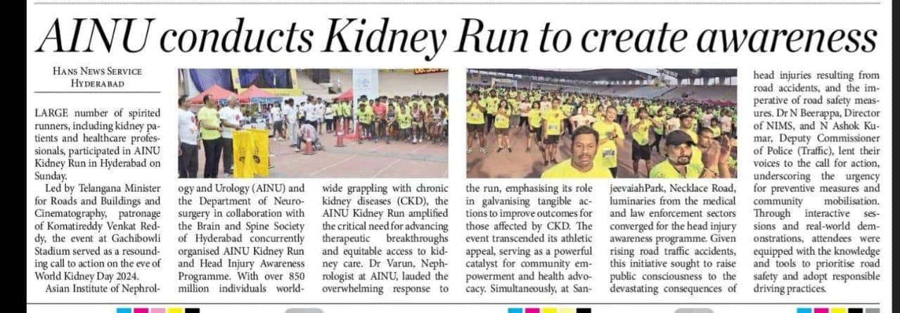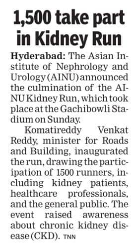 Minister Sri Komatireddy Venkat Reddy Flags off AINU Kidney RunThe Asian Institute of Nephrology and Urology (AINU) proudly announces the triumphant culmination of the AINU Kidney Run, held on Sunday, at the Gachibowli Stadium. Sri Komatireddy Venkat Reddy Minister for Roads and Buildings and Cinematography, Govt. of Telangana flagged off the run, which was participated by 1500 runners including kidney patients, healthcare professionals, and the general public. The event which was organized on the eve of World Kidney Day marks a significant stride towards raising awareness about chronic kidney disease (CKD) and fostering community engagement in combating this global health challenge.