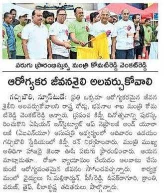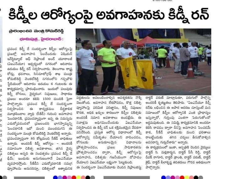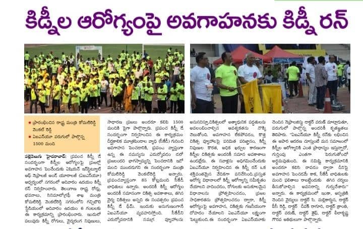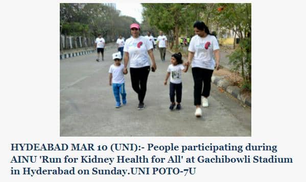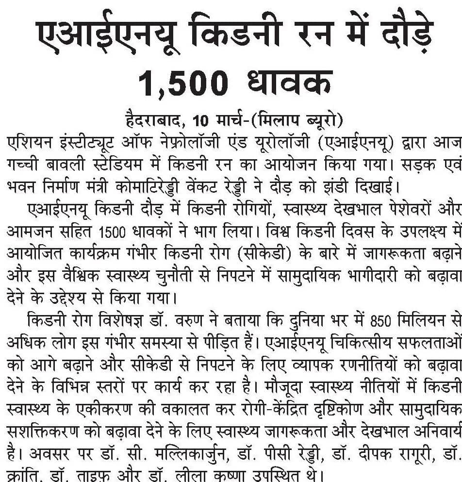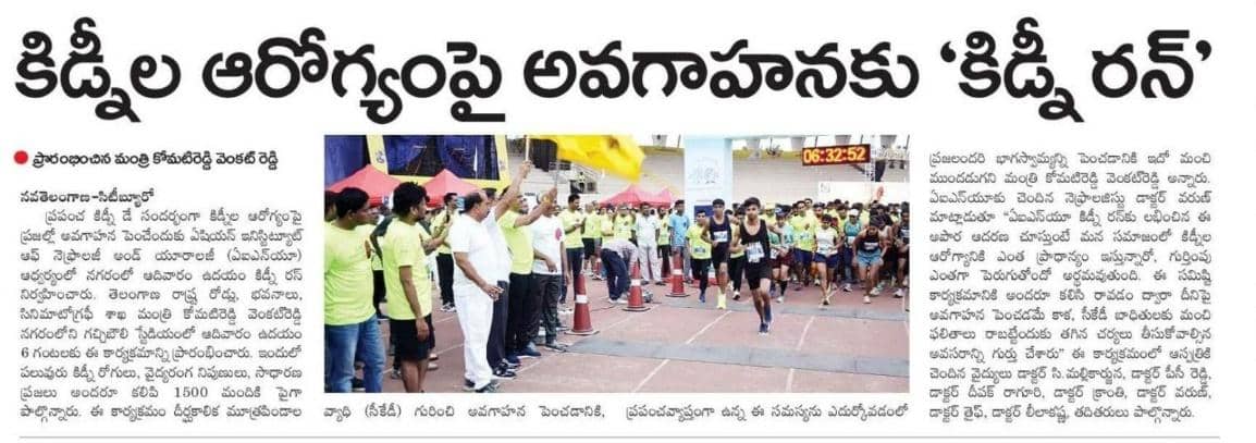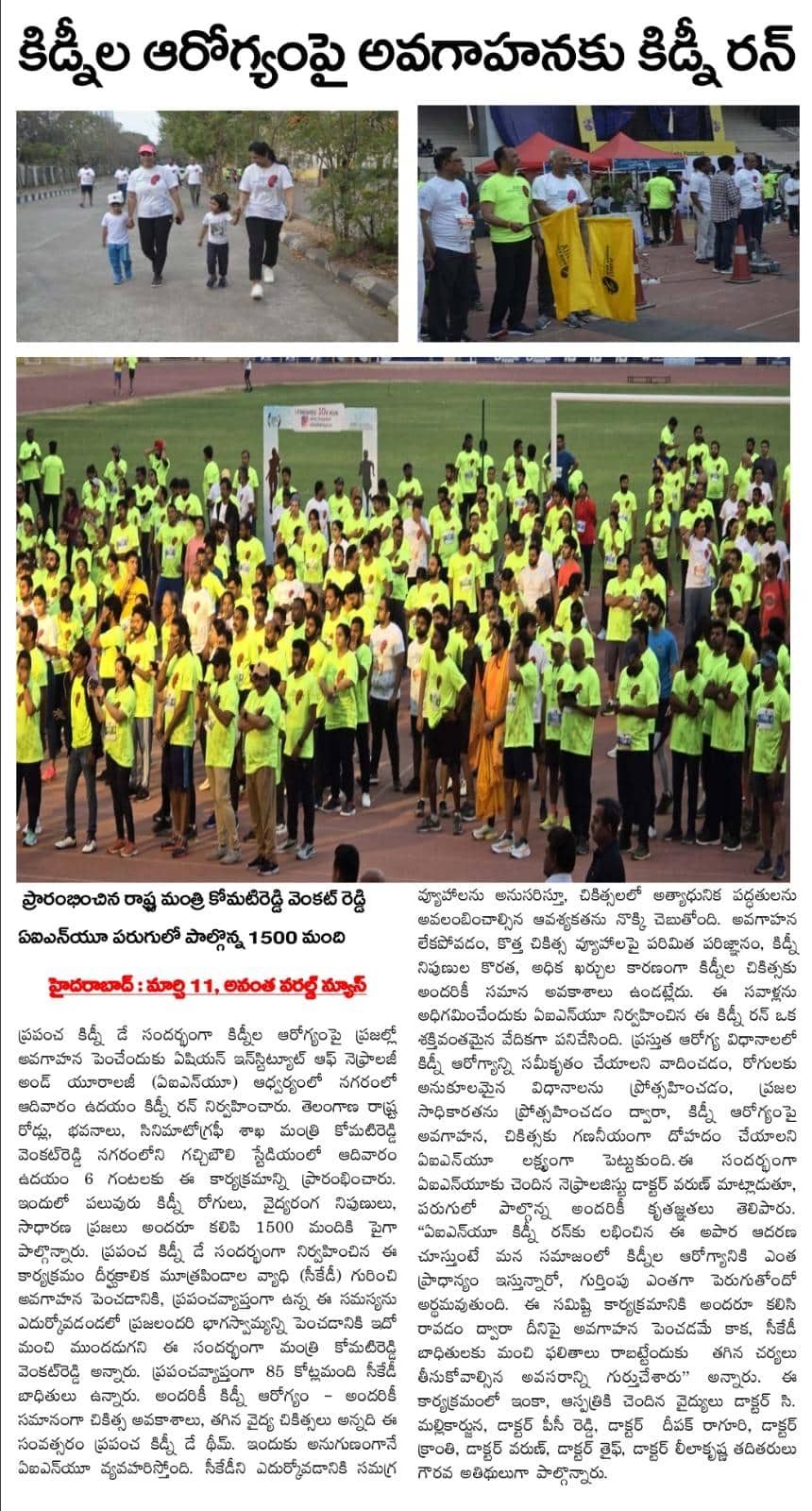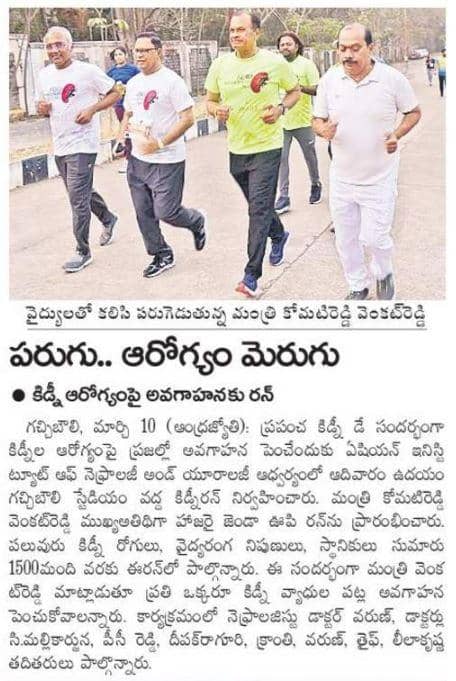 Minister Sri Komatireddy Venkat Reddy Flags off AINU Kidney RunThe Asian Institute of Nephrology and Urology (AINU) proudly announces the triumphant culmination of the AINU Kidney Run, held on Sunday, at the Gachibowli Stadium. Sri Komatireddy Venkat Reddy Minister for Roads and Buildings and Cinematography, Govt. of Telangana flagged off the run, which was participated by 1500 runners including kidney patients, healthcare professionals, and the general public. The event which was organized on the eve of World Kidney Day marks a significant stride towards raising awareness about chronic kidney disease (CKD) and fostering community engagement in combating this global health challenge.
