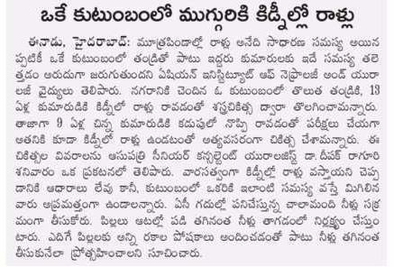 “ఆ కుటుంబంలో తండ్రికి, 13 ఏళ్ల వ‌య‌సున్న పెద్ద కుమారుడికి గ‌తంలో కిడ్నీల‌లో రాళ్లు తొల‌గించ‌గా, 9 ఏళ్ల వ‌య‌సున్న చిన్న కుమారుడికి కూడా ఇప్పుడు రాళ్లు ఏర్ప‌డ‌టంతో అత్య‌వ‌స‌రంగా శ‌స్త్రచికిత్స చేయాల్సి వ‌చ్చింది. పైపెచ్చు, ఆ బాలుడికి ఎడ‌మ‌వైపు మూత్ర‌పిండంలో ఒక‌టి, మూత్ర‌నాళంలో మ‌రొకటి రాళ్లు ఉన్నాయి. దాంతో తీవ్ర‌మైన నొప్పి రావ‌డంతో వెంటనే శ‌స్త్రచికిత్స చేసి తొల‌గించాల్సి వ‌చ్చింది. కుడివైపు కూడా అత‌డికి నొప్పి మొద‌లైంది. చూస్తే అక్క‌డ కూడా రాయి ఉంది. అయితే సాధార‌ణంగా ఒకేసారి రెండువైపులా కిడ్నీలో రాళ్లు తొల‌గించం. అందువ‌ల్ల దానికి మ‌రోసారి చేయాల్సి ఉంటుంది. దీన్ని వార‌సత్వం అని చెప్ప‌లేము గానీ, కుటుంబంలో ఎవ‌రికైనా ఈ స‌మ‌స్య ఉంటే మాత్రం కొంచెం అప్ర‌మ‌త్తం కావ‌డం మంచిది” అని చెప్పారు.