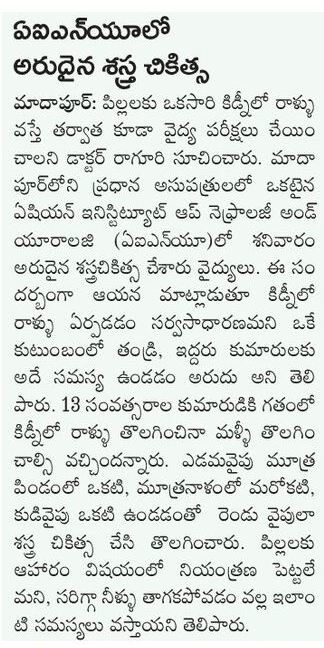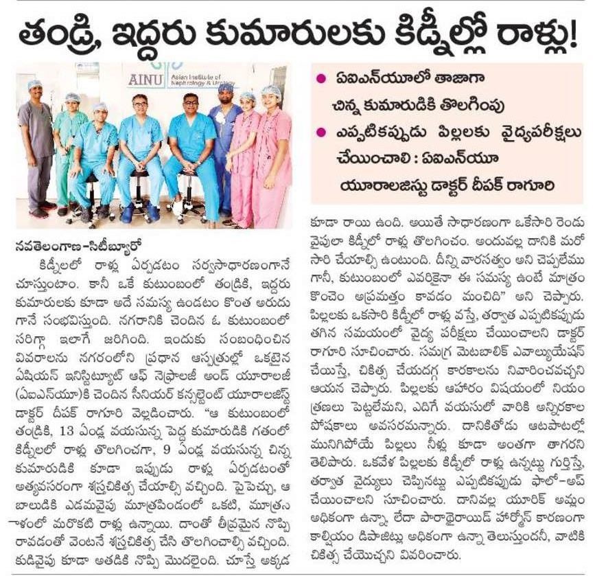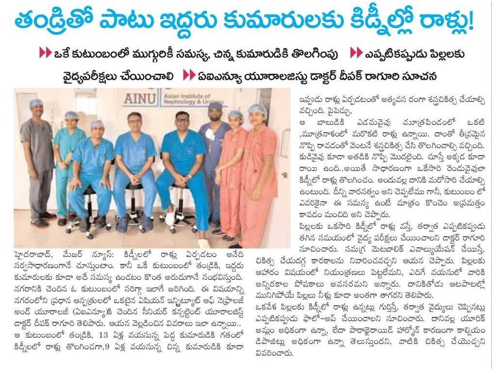 కిడ్నీల‌లో రాళ్లు ఏర్ప‌డ‌టం అనేది స‌ర్వ‌సాధార‌ణంగానే చూస్తుంటాం. కానీ ఒకే కుటుంబంలో తండ్రికి, ఇద్ద‌రు కుమారుల‌కు కూడా అదే స‌మ‌స్య ఉండ‌టం కొంత అరుదుగానే సంభ‌విస్తుంది. న‌గ‌రానికి చెందిన ఓ కుటుంబంలో స‌రిగ్గా ఇలాగే జ‌రిగింది. ఈ విష‌యాన్ని న‌గ‌రంలోని ప్ర‌ధాన ఆస్ప‌త్రుల‌లో ఒక‌టైన ఏషియ‌న్ ఇన్‌స్టిట్యూట్ ఆఫ్ నెఫ్రాల‌జీ అండ్ యూరాల‌జీ (ఏఐఎన్‌యూ)కి చెందిన సీనియ‌ర్ క‌న్స‌ల్టెంట్ యూరాల‌జిస్ట్ డాక్ట‌ర్ దీప‌క్ రాగూరి తెలిపారు. ఆయ‌న వెల్ల‌డించిన వివ‌రాలు ఇలా ఉన్నాయి..